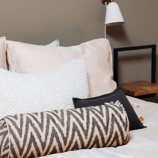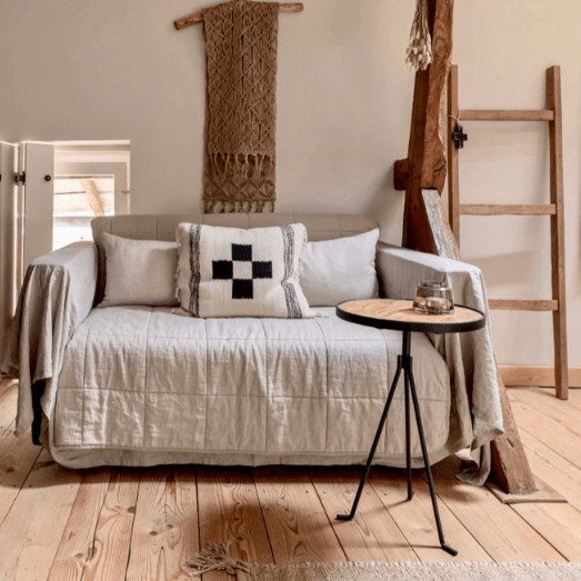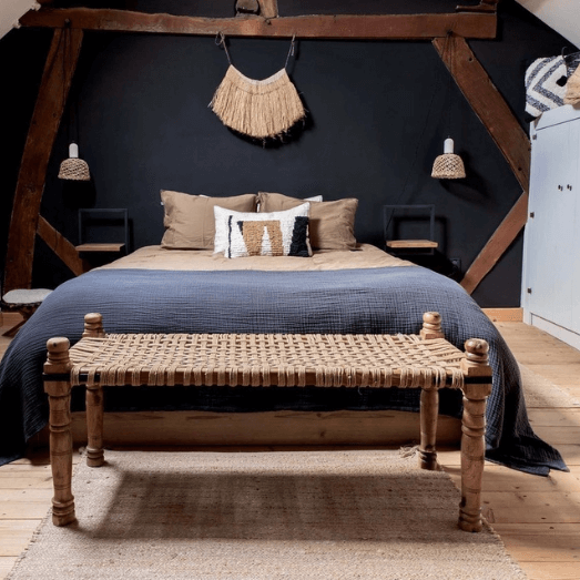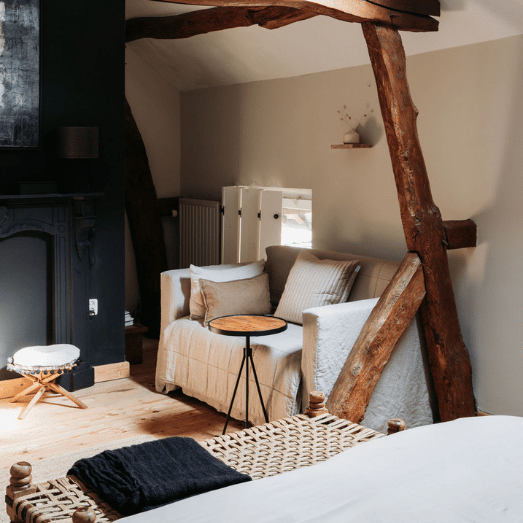 De slaap- zitkamer met eeuwenoude balken bevindt zich op de verdieping. Er is een extra lang tweepersoonsbed (210cm)voorzien van Emma matrassen en fijn beddengoed van Essenza en lekkere kussens. Het hoge dakraam zorgt voor veel licht, en vanuit het lage raam met luiken kijk je uit op de binnenplaats. Er staat een bankje in de zithoek evenals een lekkere stoel, een platenspeler en boeken en tijdschriften.