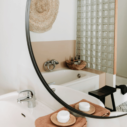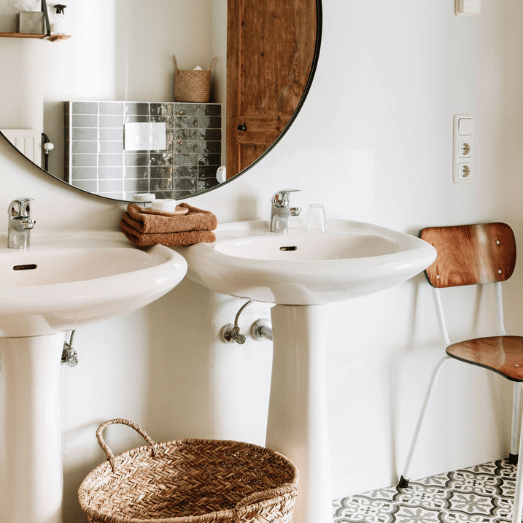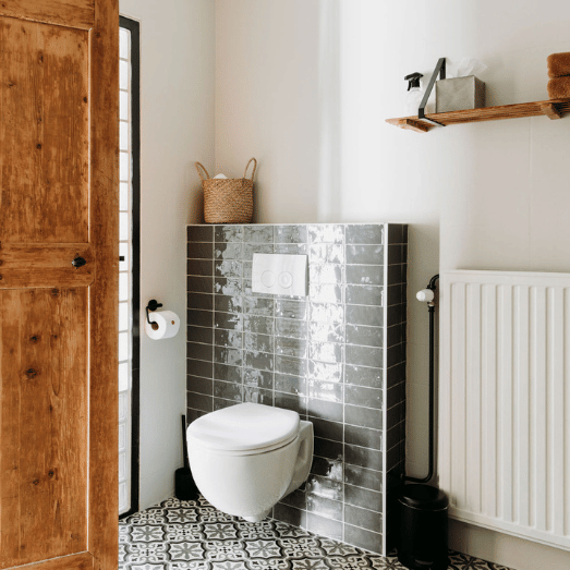 Op de begane grond is ook de grote badkamer met charmante vloertegels, dubbele wastafel, ligbad en douche. Dikke handdoeken en badproducten van Meraki liggen voor je klaar.